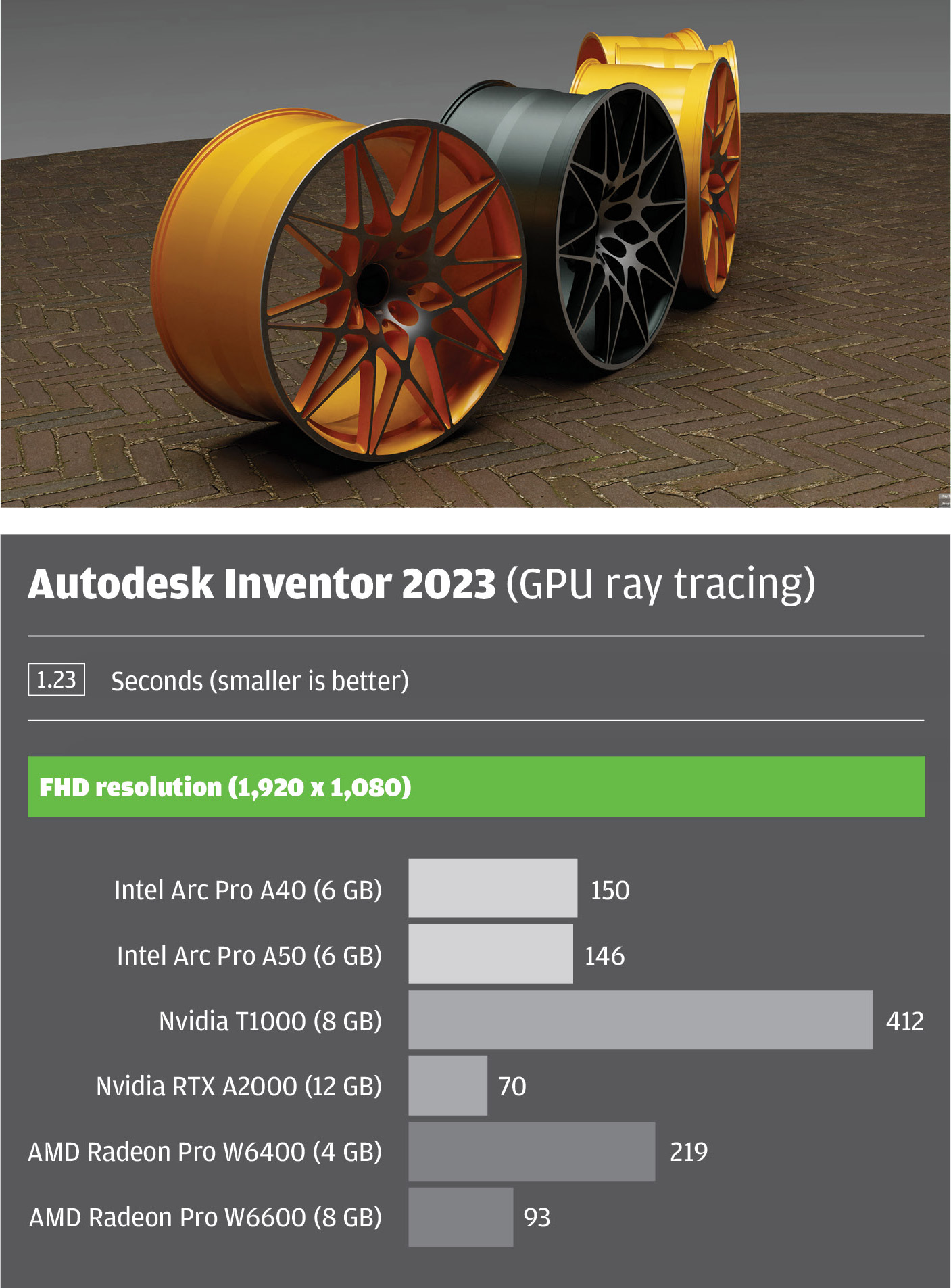 Testing for performance using the Invmark for Inventor benchmark both the Intel Arc Pro A40 and Arc Pro A50 came in second to the AMD and Nvidia cards.
