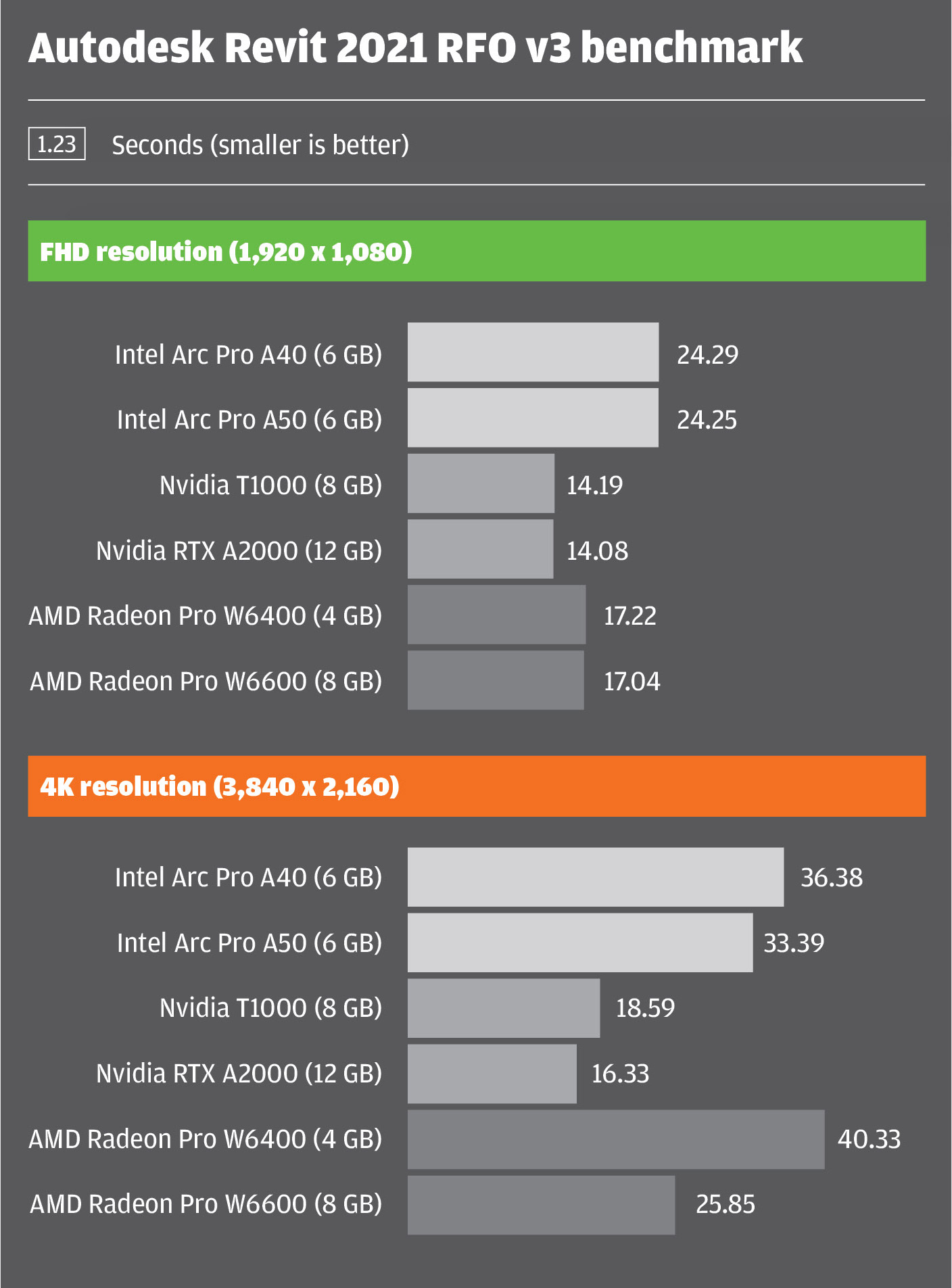 To assess relative performance, we ran the RFO 3.1 benchmark for Revit 2021. Here both the Arc Pro A40 and A50 edged out the AMD Radeon Pro W6400 at 4K, but not at FHD. The Nvidia T1000 and Nvidia RTX A2000 were some way ahead.