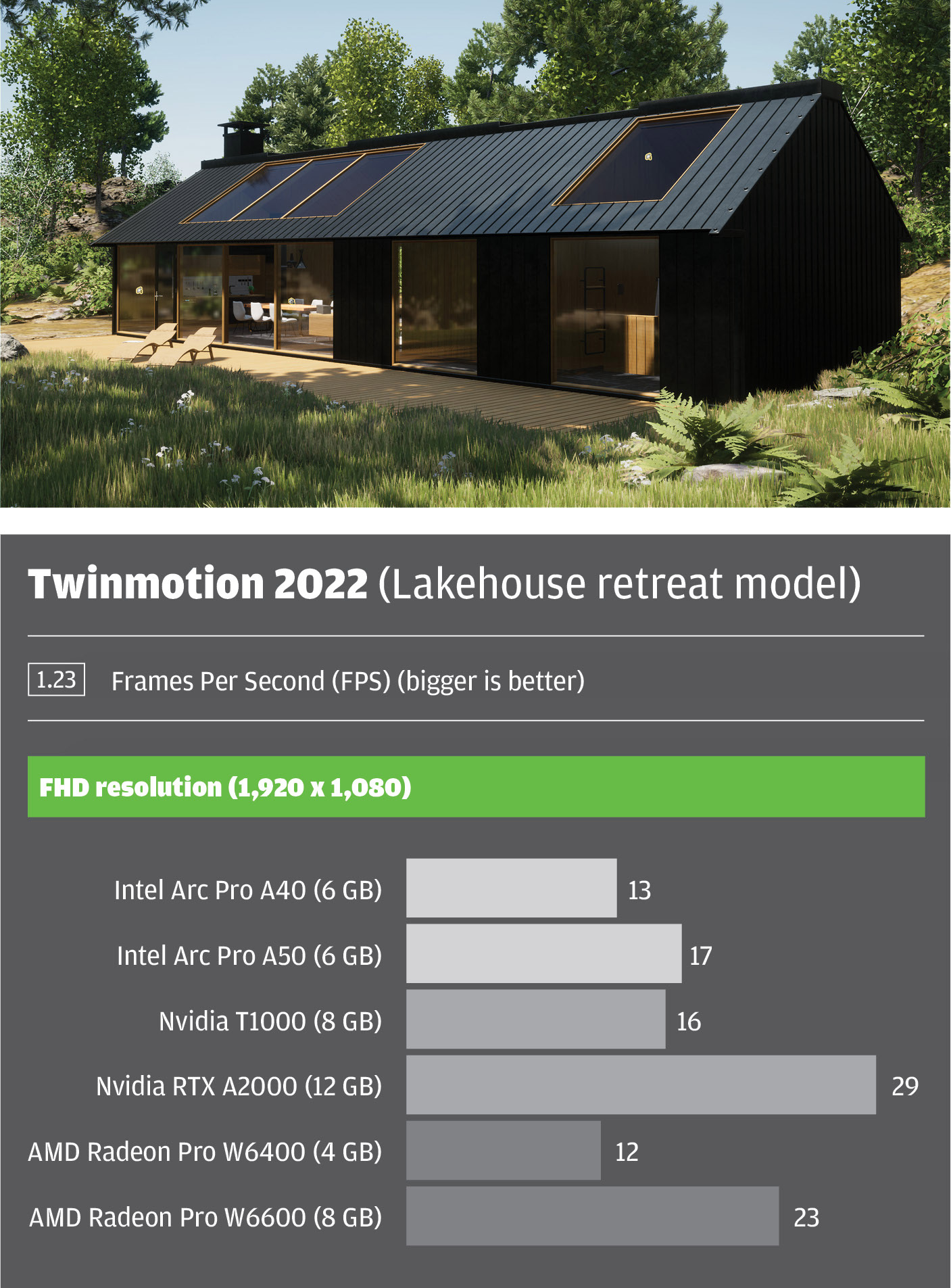 One observation was that the Arc Pro GPUs appeared to use more memory than GPUs from AMD or Nvidia when loading the same datasets. With the Lakehouse retreat model in Twinmotion, for example, the Arc Pro A50 used around 5.2 GB whereas the Nvidia T1000 used around 1 GB less. So, while the Arc Pro A40 and A50 give you 2 GB more than other entry-level pro GPUs – the AMD Radeon Pro W6400, Nvidia T400, Nvidia T600 and Nvidia T1000 (4 GB) – the difference in usable memory might not be as big.