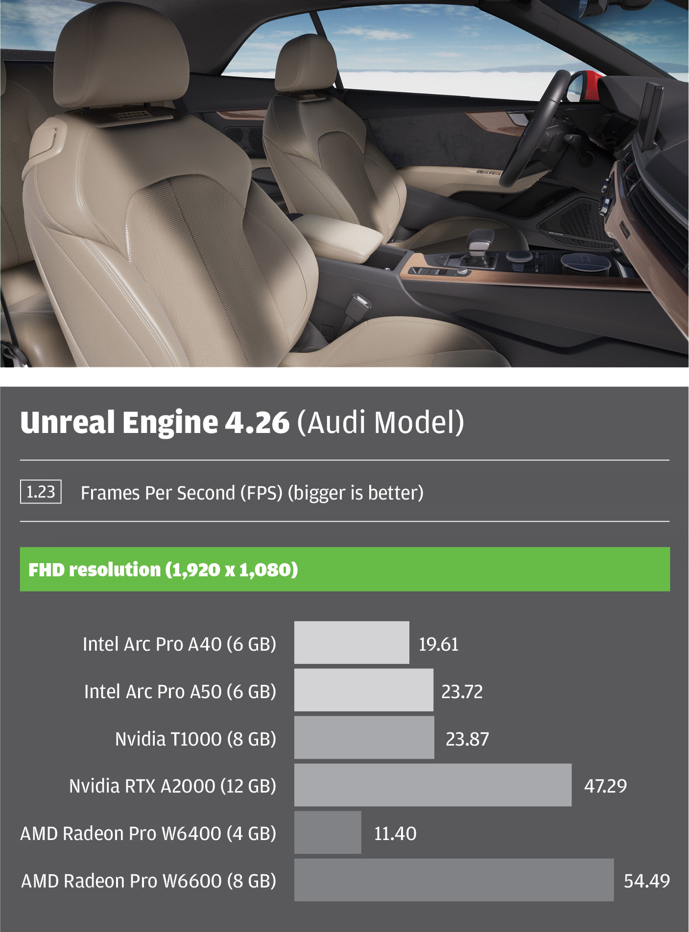 Unreal Engine needs little introduction. As well as being the world’s leading game engine, it’s making huge strides in design visualisation, in both AEC and automotive. While we wouldn’t recommend that anyone use the Arc Pro A40 or A50 for creating real time experiences in Unreal Engine, testing the GPUs with the engine does give a good indication of where their performance lies and what a consumer of Unreal Engine real time experiences might expect. At FHD resolution, the Arc Pro A50 was on par with the Nvidia T1000 (8 GB).