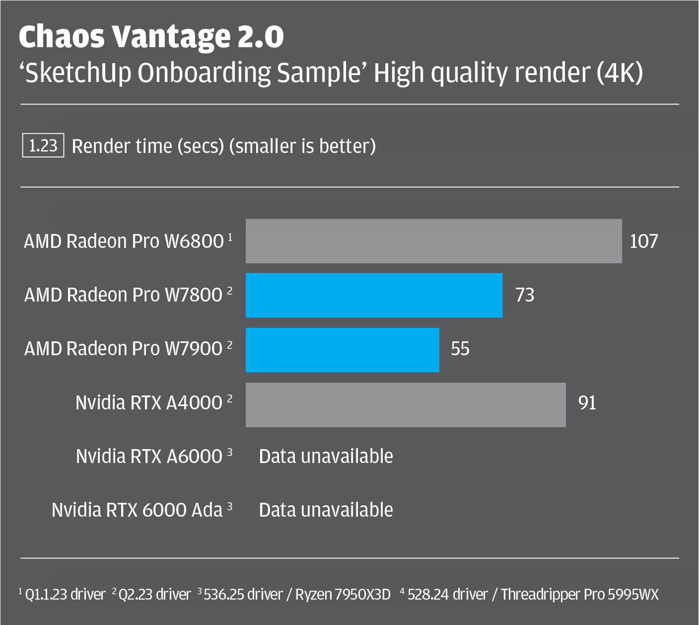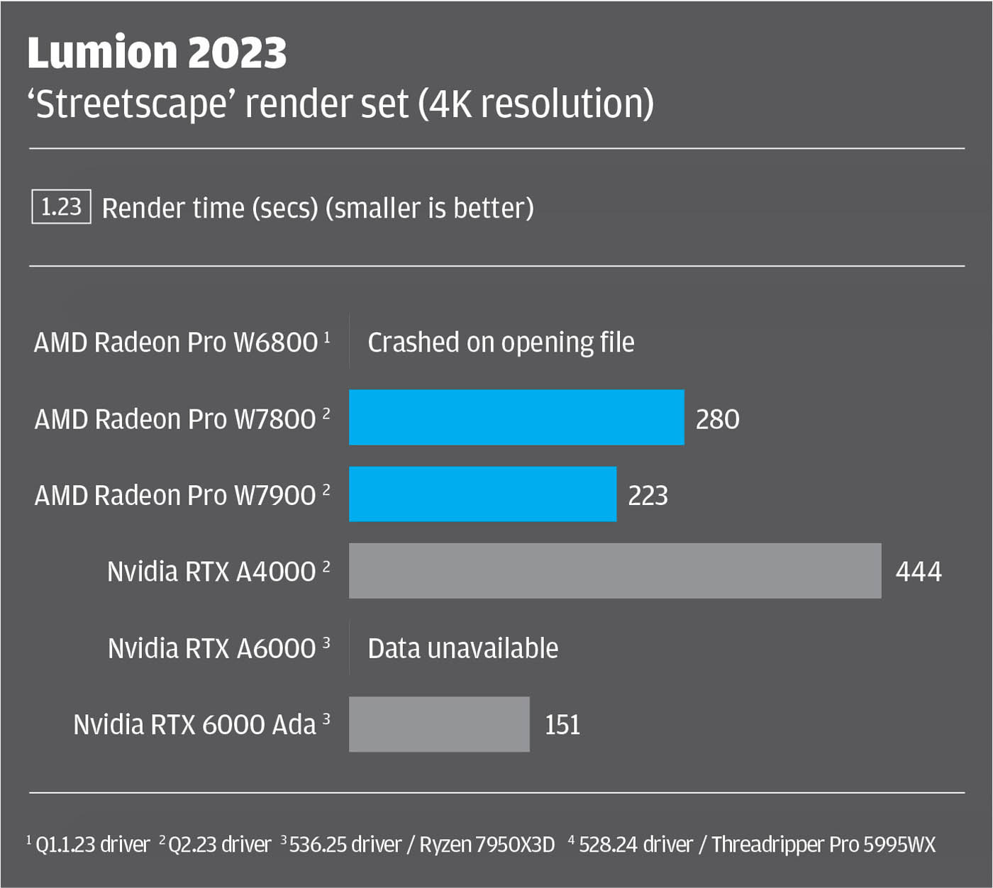 During our testing we identified three pro applications which currently do not work with the Radeon Pro W7800 and W7900. These include product design rendering software, Solidworks Visualize (Radeon ProRender), the v0.9 Ray Tracing Effect in real-time architectural rendering software Lumion 2023, and older versions of real-time arch viz software Enscape.