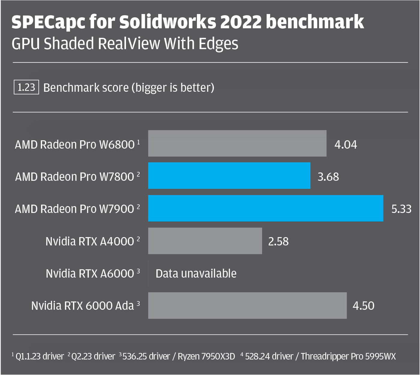 In graphics intensive real-time viz tools, the CPU shouldn’t make that big a difference. However, in the SPECapc for Solidworks benchmark, we would expect scores on the AMD Ryzen 7950X3D to be elevated a fair bit, as the processor is faster than the AMD Threadripper Pro 5995WX in single threaded and lightly threaded workflows. In saying that, the scores aren’t that relevant as all of the GPUs we tested are more than powerful enough for 3D CAD.