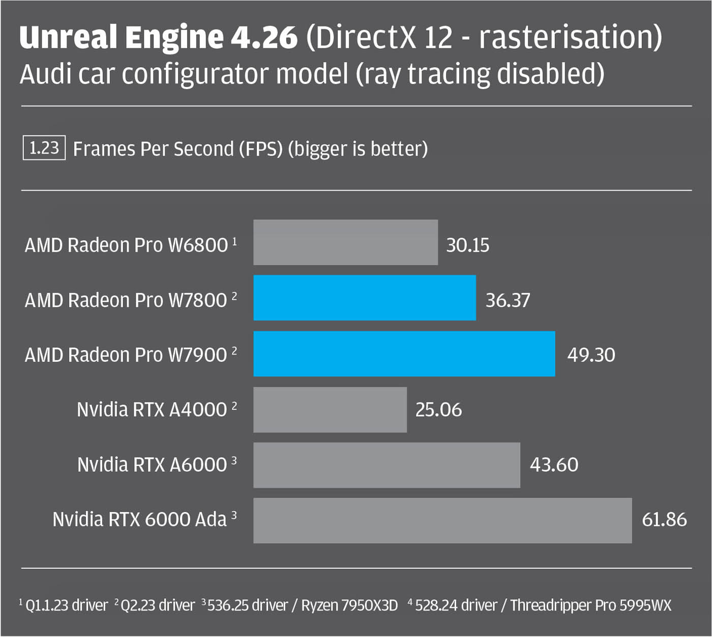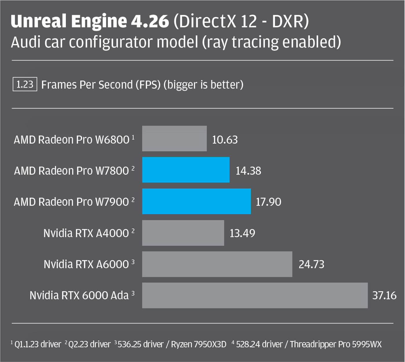 Despite the big improvements within the AMD camp, the Radeon Pro W7900 can’t keep pace with the Nvidia RTX 6000 Ada Generation. It wasn’t that far off in mainstream 3D workflows — the RTX 6000 Ada was only 27% faster in VRED Professional and 25% faster in Unreal Engine. However, when ray tracing was enabled in Unreal Engine, the RTX 6000 Ada pulled away dramatically, delivering more than double the frame rates of the W7900. AMD’s ray accelerators are one generation behind Nvidia’s and it’s clear it has some catching up to do.