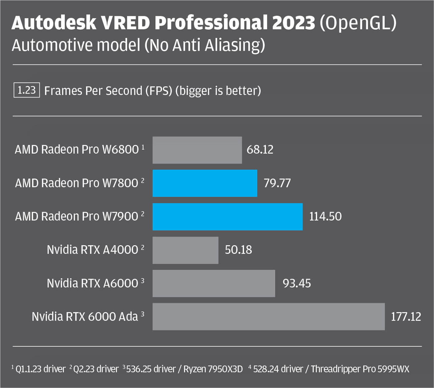 For users of these tools this will be disappointing, especially for a pro GPU. However, AMD is aware of these issues and is currently working on fixes. We already have the W7800 and W7900 running with the soon to be released Solidworks Visualize 2024. However, because the software is still in beta, we are not allowed to use it for benchmarking.