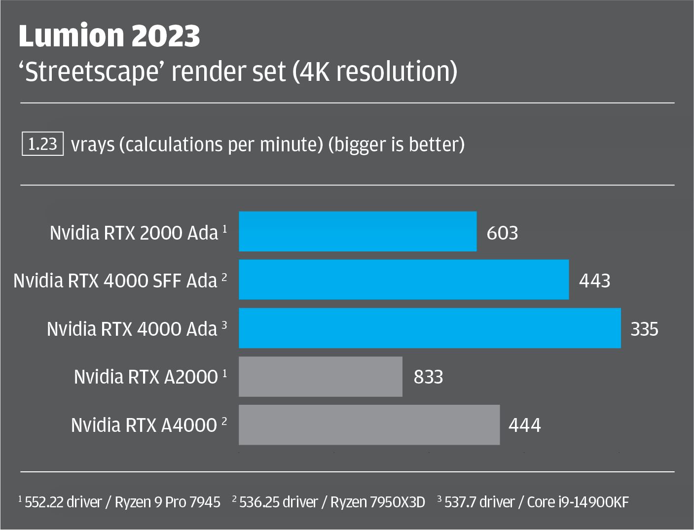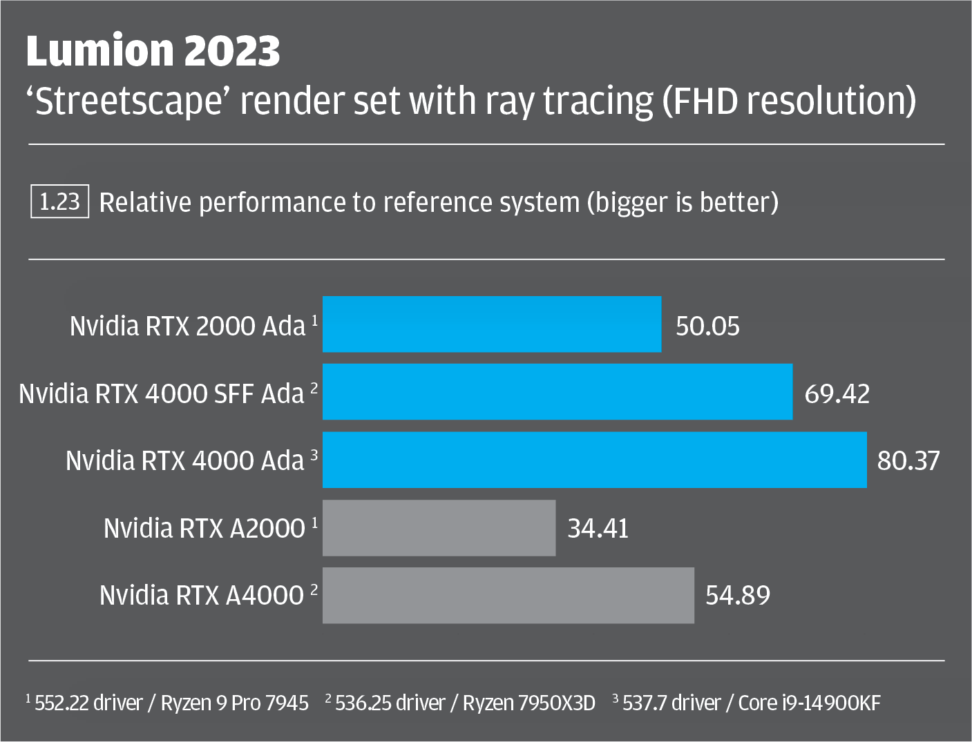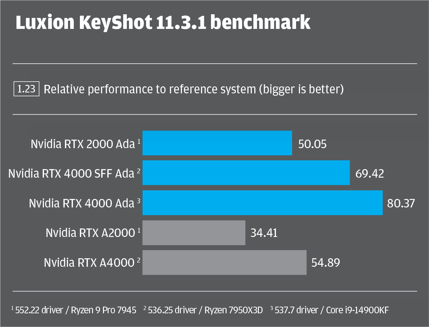We would expect the Nvidia RTX 4000 Ada benchmark scores to be elevated a little in 3D CAD, as the Intel Core i9-14900KF is faster in single threaded and lightly threaded workflows and CAD is typically CPU limited for 3D graphics. However, in graphics intensive real-time viz tools, the partner CPU shouldn’t make as much difference and, in GPU rendering, very little at all.