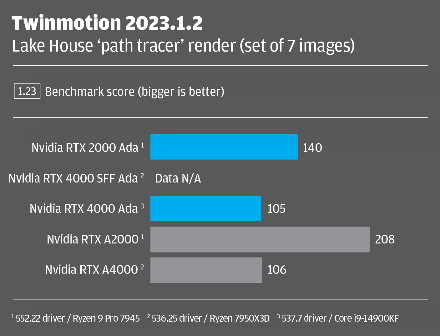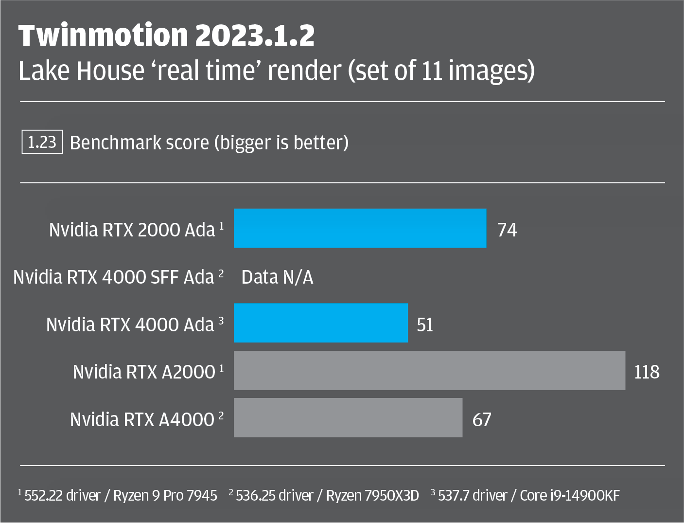 For the other two GPUs, benchmark data was taken from previous lab tests. The Nvidia RTX 4000 SFF Ada and Nvidia RTX A4000 with 536.25 driver were tested inside an AMD Ryzen 9 7950X3D-based workstation from Armari. The Nvidia RTX 4000 Ada with 537.7 driver was tested in an Intel Core i9-14900KF-based workstation from Workstation Specialists.