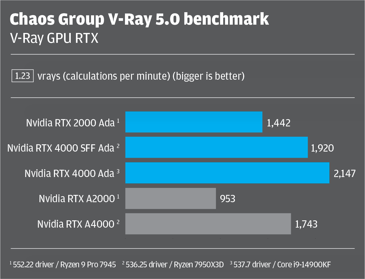 Here, it’s important to state that our benchmark comparisons are not perfect, as not all GPUs were tested in the same machine. For the Nvidia RTX 2000 Ada and Nvidia RTX A2000 we used the latest 552.22 driver inside an AMD Ryzen 9 Pro 7945-based Scan GWP-CAD A124R Micro workstation.