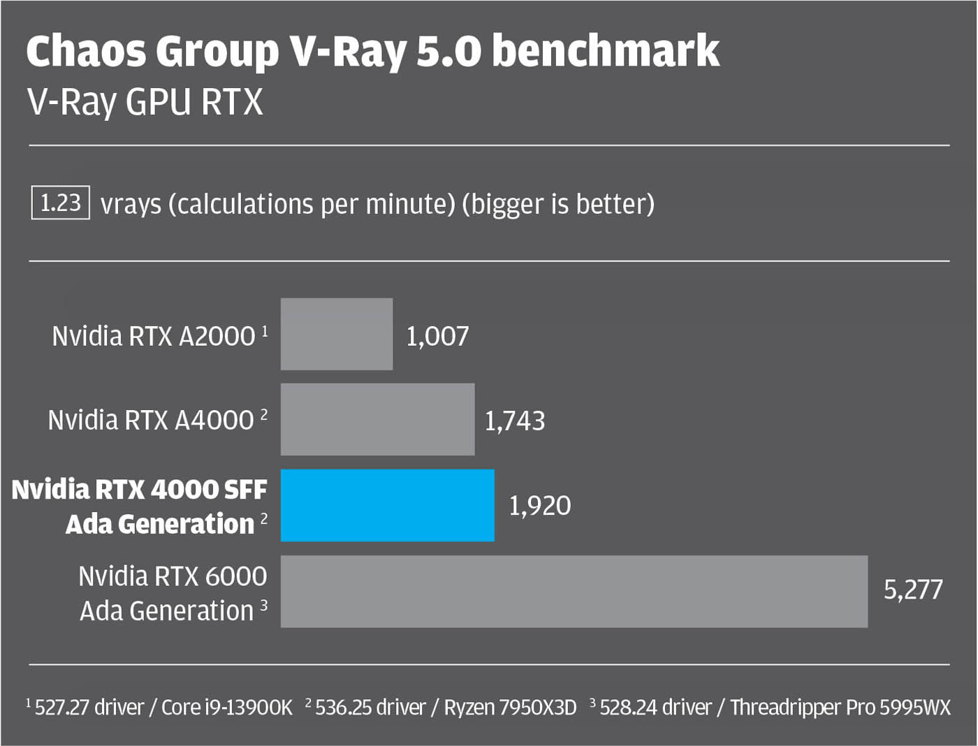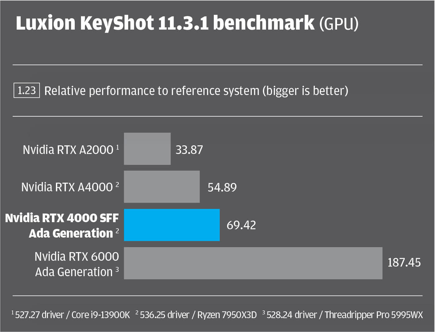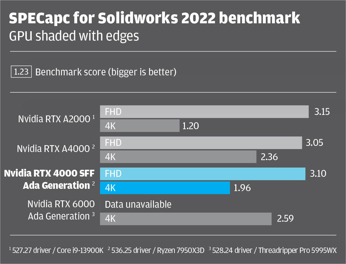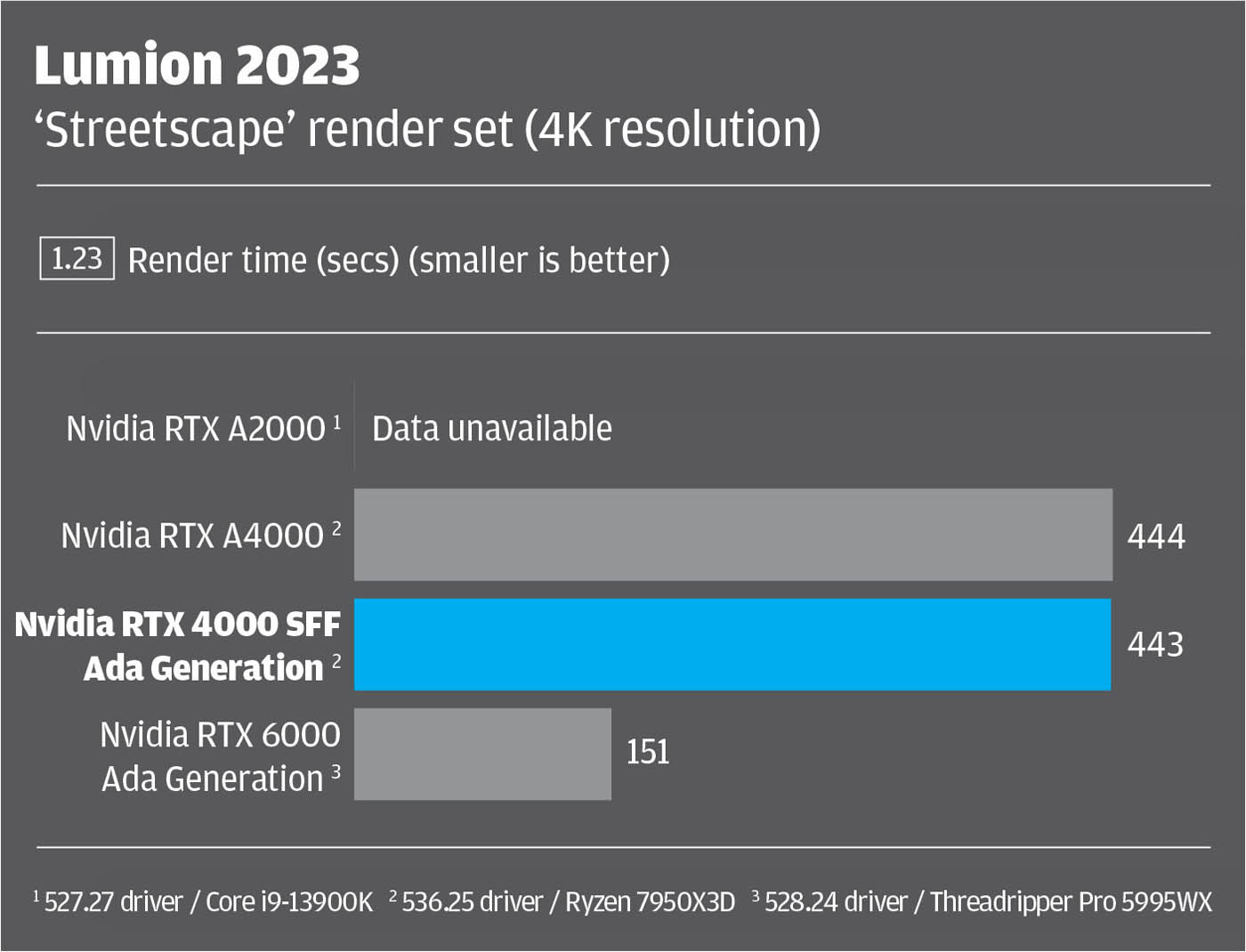 Here, it’s important to state that our benchmark comparisons aren’t perfect, as not all GPUs were tested in the same machine. For the Nvidia RTX 4000 SFF Ada generation and Nvidia RTX A4000 we used the latest 536.25 driver inside an AMD Ryzen 7950X3D-based workstation from Armari. For the other two GPUs data was taken from previous articles. The Nvidia RTX A2000 with 527.27 driver was tested inside an overclocked Intel Core i9-13900K-based BOXX Apexx S4 workstation. The Nvidia RTX 6000 Ada with 528.24 driver was tested inside an AMD Threadripper Pro 5995WX-based workstation.
