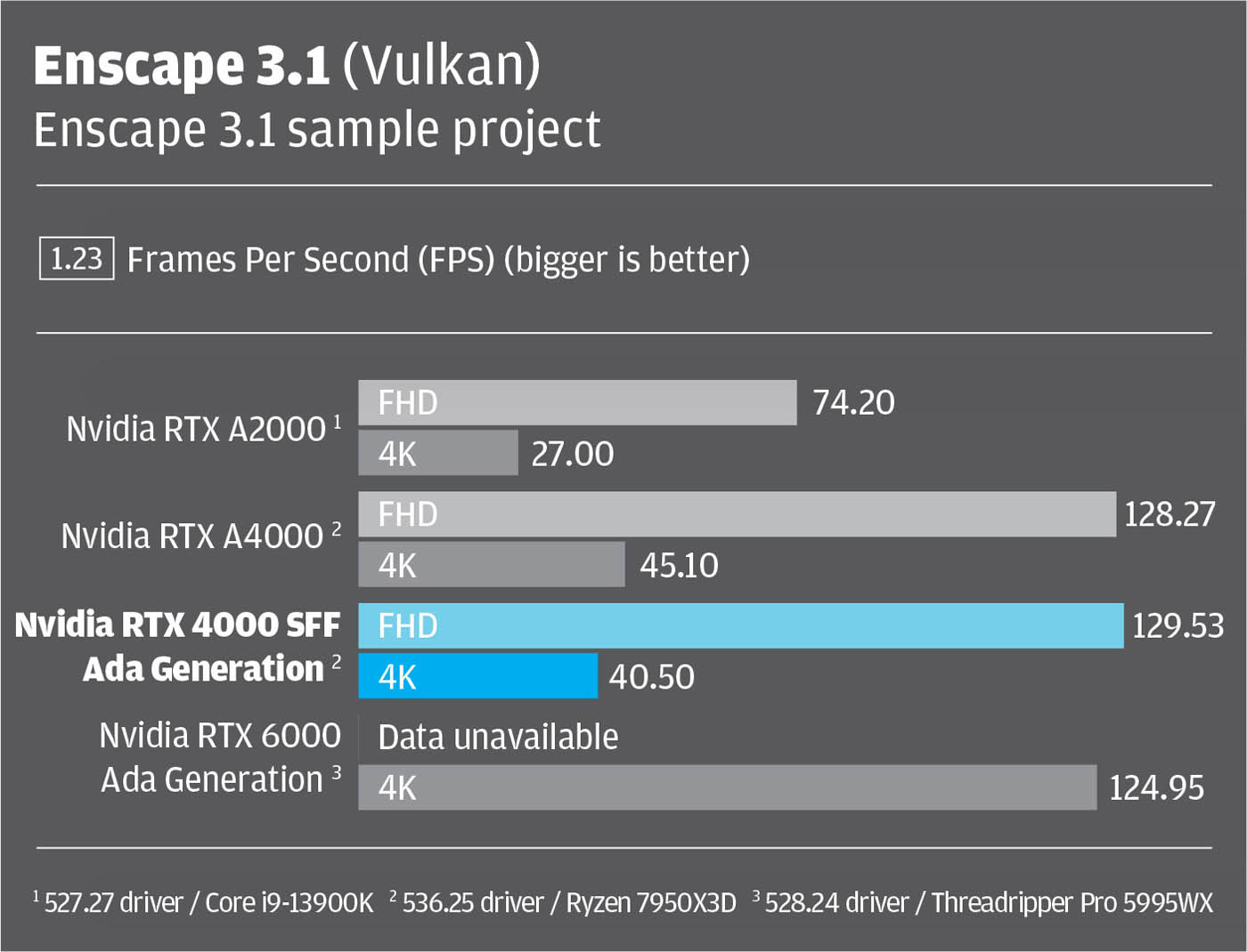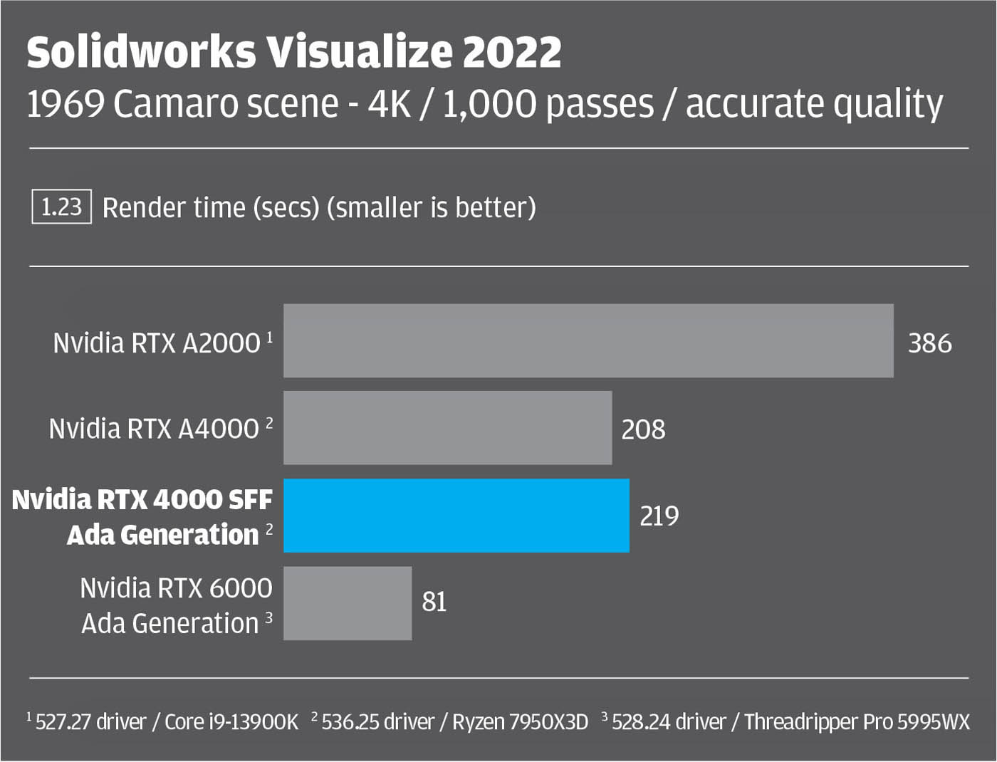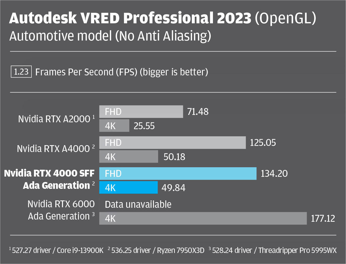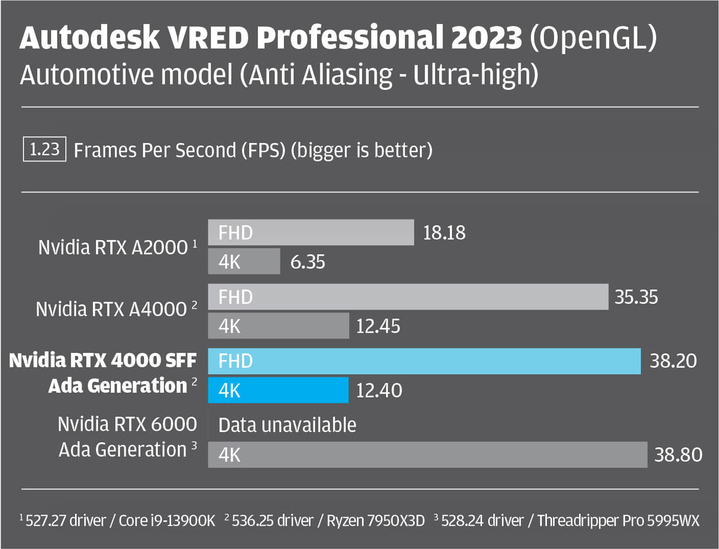 Here, it’s important to state that our benchmark comparisons aren’t perfect, as not all GPUs were tested in the same machine. For the Nvidia RTX 4000 SFF Ada generation and Nvidia RTX A4000 we used the latest 536.25 driver inside an AMD Ryzen 7950X3D-based workstation from Armari. For the other two GPUs data was taken from previous articles. The Nvidia RTX A2000 with 527.27 driver was tested inside an overclocked Intel Core i9-13900K-based BOXX Apexx S4 workstation. The Nvidia RTX 6000 Ada with 528.24 driver was tested inside an AMD Threadripper Pro 5995WX-based workstation.