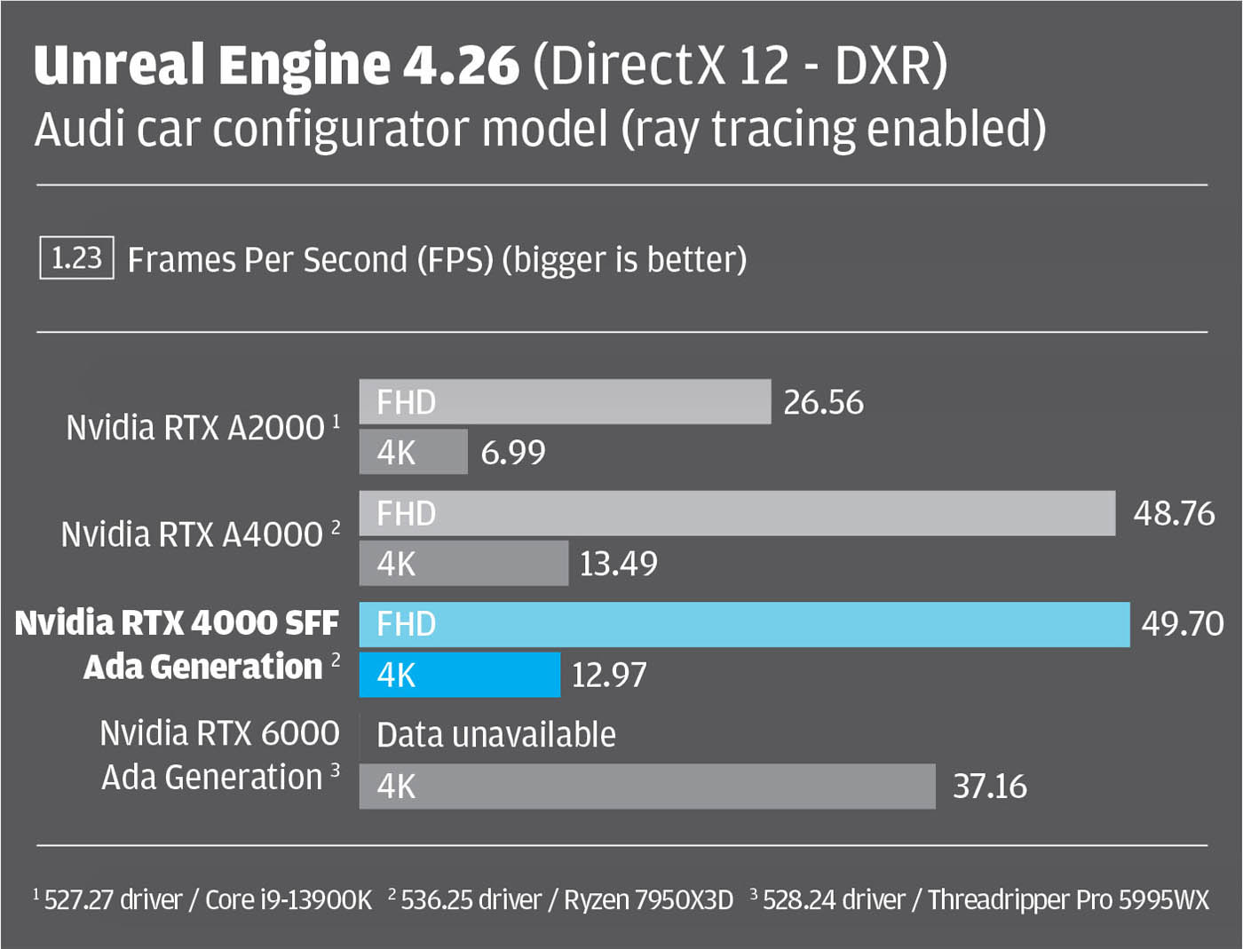 The RTX 4000 SFF Ada brings real benefits to real-time viz. Whereas the RTX A2000 falters a little in some 4K workflows, the RTX 4000 SFF Ada just keeps going. It’s only when anti-aliasing is set to ultra-high in VRED Professional 2023, or real time ray tracing is enabled in Unreal Engine 4.26, that it starts to struggle, staying well below the desirable 20+ Frames Per Second (FPS).